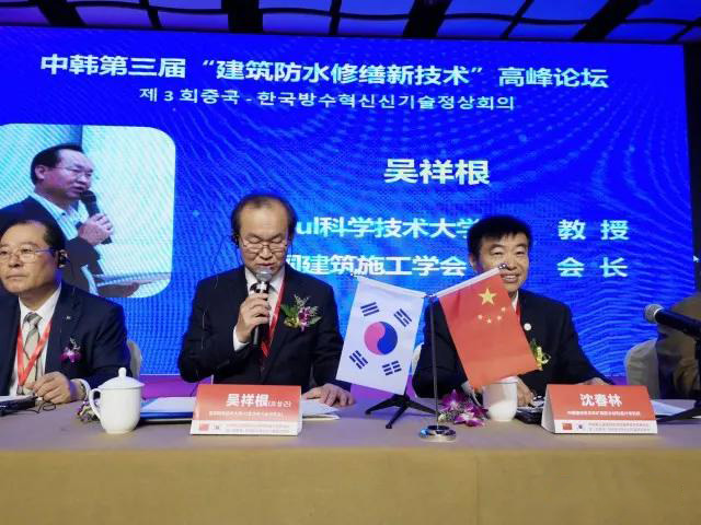 本次会议以“建筑防水修缮新技术”为主题,会议汇集中、韩两国防水大咖齐聚一堂,韩国首尔科技大学吴祥根教授一行28位韩国防水专家莅临会议交流。中国建材苏州非矿院防水材料设计研究所所长,湖北工业工业大学硕士生导师,享受国务院特殊津贴著名防水专家沈春林教授、韩国首尔科技大学防水技术研究中心吴祥根教授及国家相关部门领导先后发表重要讲话,通过对当前我国建筑防水修缮行业的分析,指出此次会议召开的重要性和必要性,并希望通过此次会议的召开,充分调动防水人的积极性,重新树立对防水行业未来市场的信心并致力于将防水修缮市场做的更好。